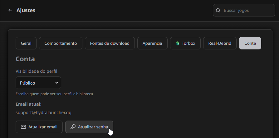 No Launcher, vá em “Ajustes” > “Conta”, e clique em “Atualizar senha”: